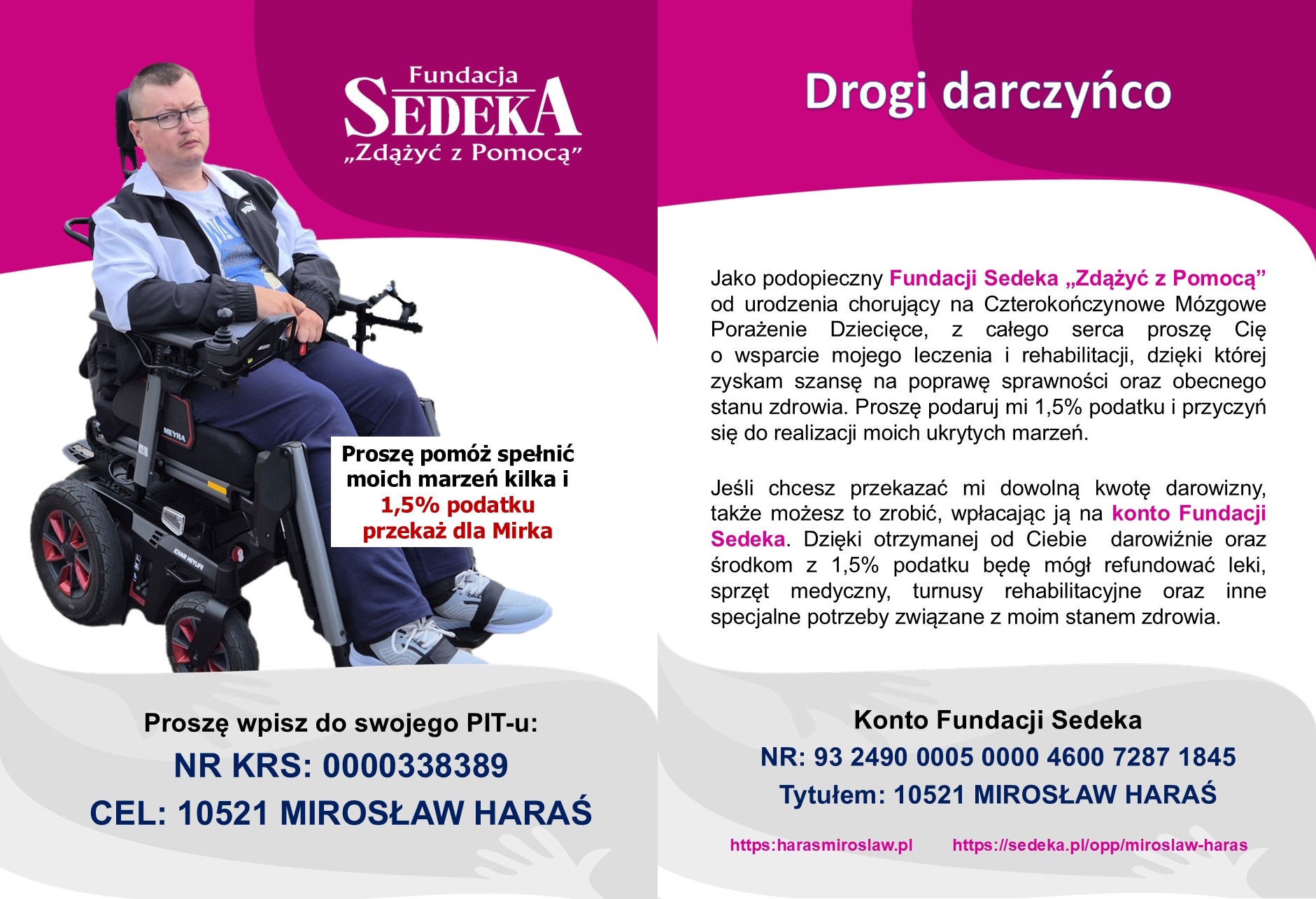 Czterokończynowe Mózgowe Porażenie Dziecięce, na które cierpię od urodzenia to choroba, która w dużym stopniu utrudnia mi funkcjonowanie w społeczeństwie i wymaga dużych nakładów finansowych. Dlatego od kilku lat jestem podopiecznym Fundacji Sedeka, dzięki czemu każdy kto ma otwarte serce i mój los nie jest mu obojętny może mnie wesprzeć. Spraw by moje życie stało się łatwiejsze, a plany i marzenia bardziej realne.